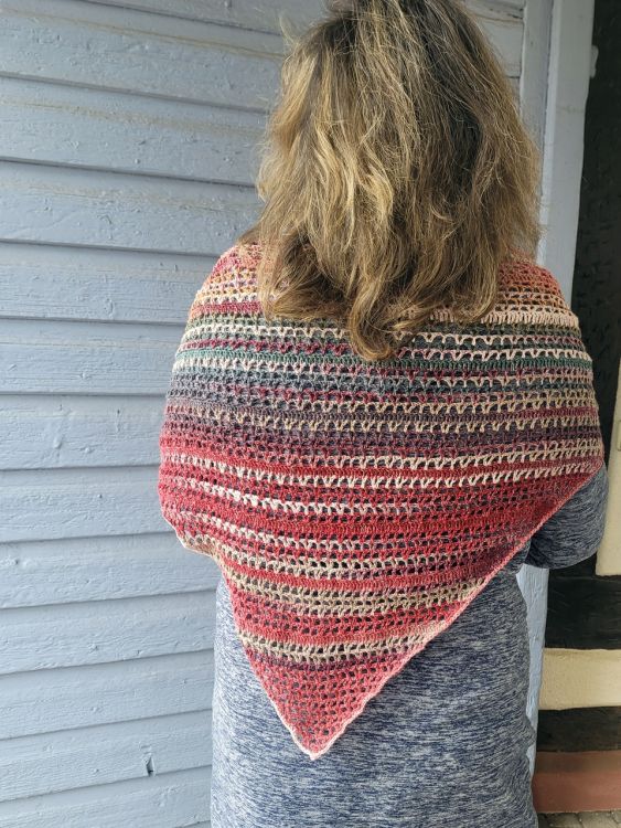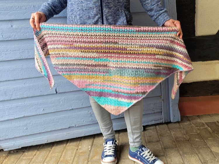 Das Häkeltuch Sommermasche vereint ein einfaches gehäkeltes Lochmuster mit eingebauten geschlossenen Streifen nur aus Stäbchen. Ich habe es in 3 Größen und aus 3 verschiedenen Garnen gehäkelt und dabei die geschlossenen Streifen unterschiedlich eingesetzt.