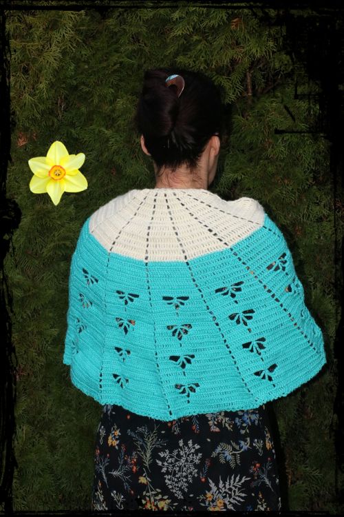 Für dieses ausgefallene Tuch habe ich 70 gr hellgelbe Wolle und 280gr türkisfarbene Acrylwolle verwendet (beides von Tedi).