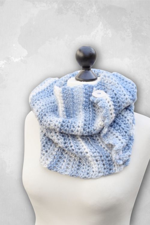 Der Halsschmeichler HELSINKI ist ein moderner Häkelloop mit Knopfverschluss und einem ruhigen Strukturmuster. Die Farbwelt erinnert an klare Wintertage mit kühler Luft und hellem Himmel. Dadurch wirkt der Loop gleichzeitig schlicht und besonders.