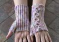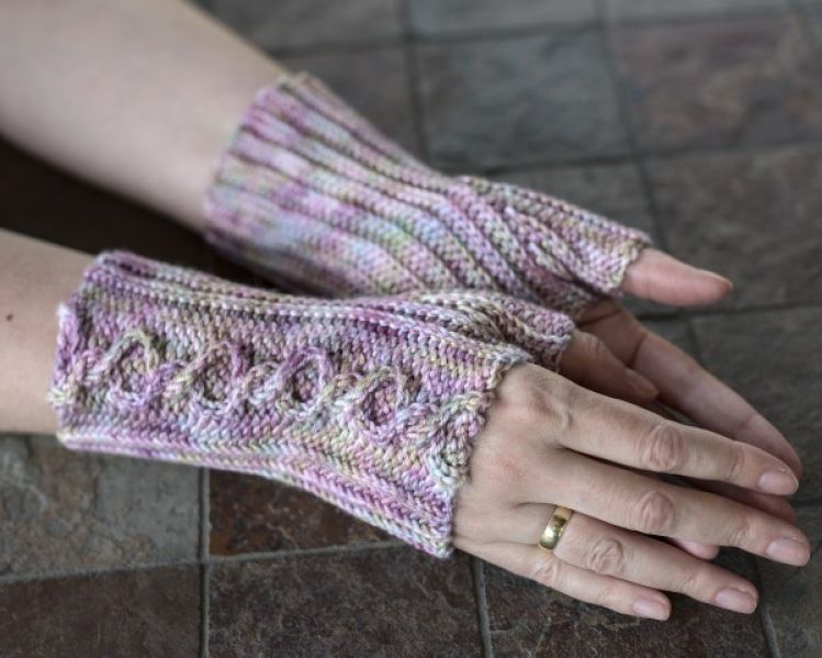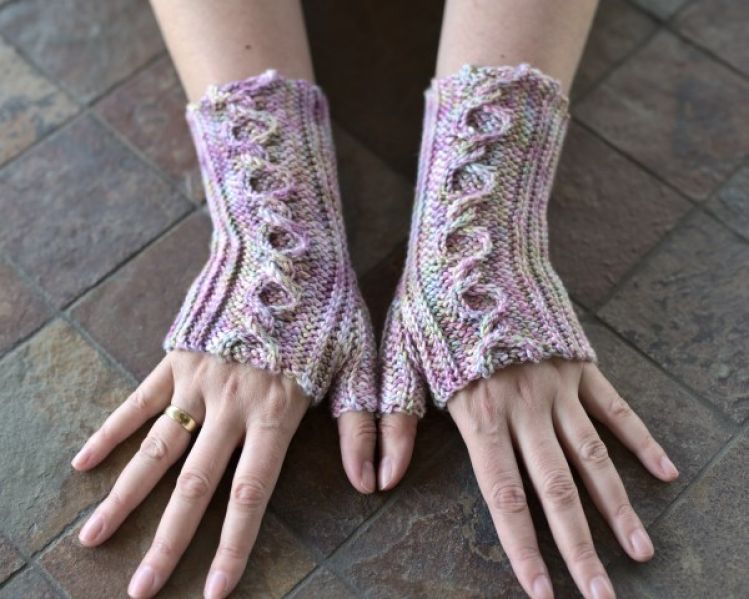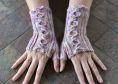 Sie werden seitwärts in Reihen gehäkelt, mit einem horizontalen Zopf auf dem Handrücken, eine Technik, die ich erfunden habe. Der Daumen wird mit verkürzten Reihen gearbeitet.