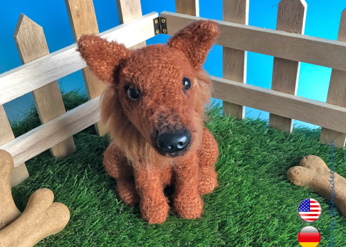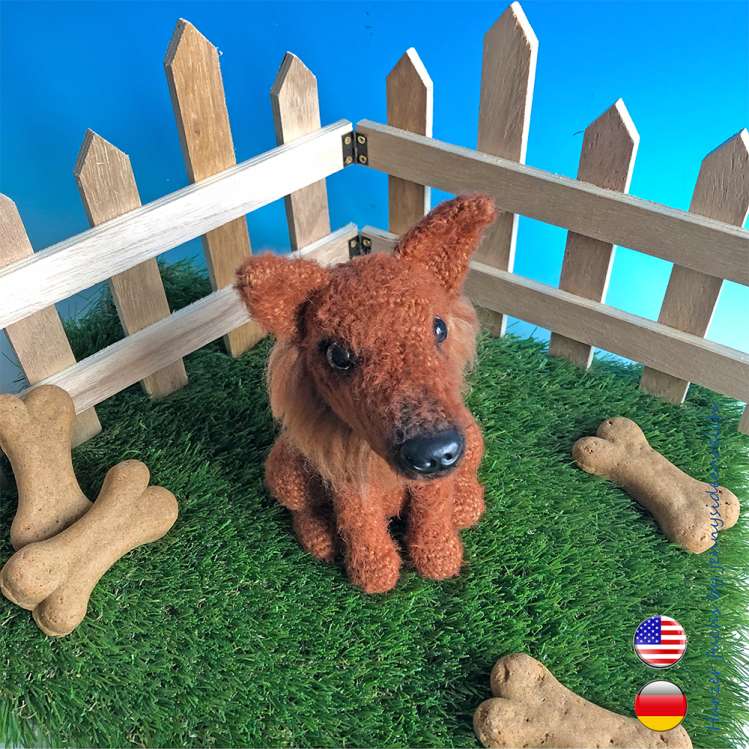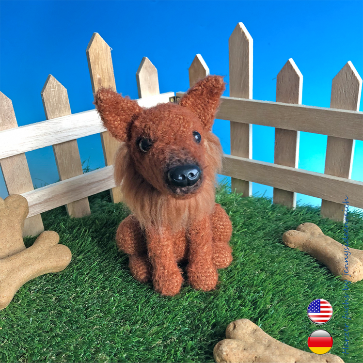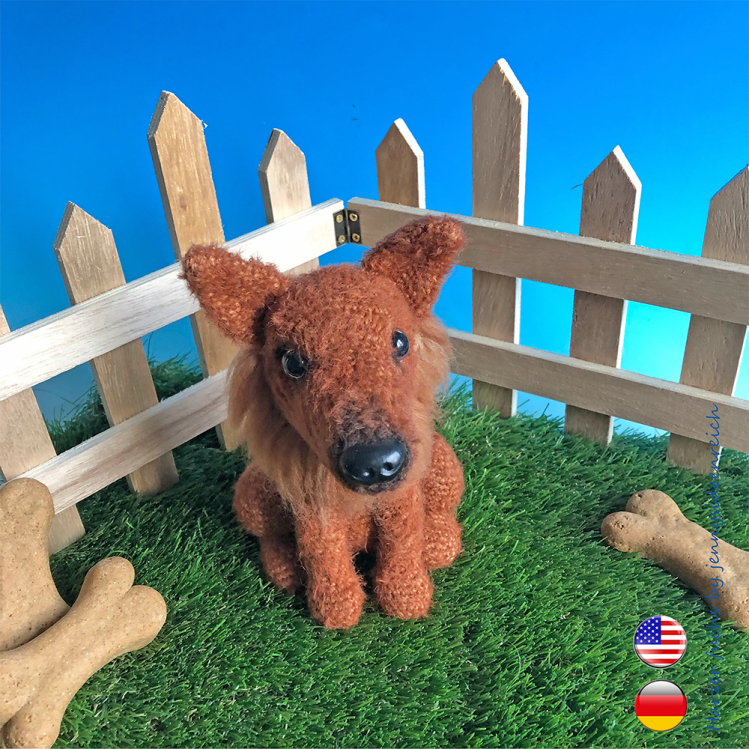 Additional material: stuffing, safety eyes 12mm, safety nose 21mm, yarn needle to sew together the parts, wool for felting in brown, felting needle, dog-brush, eyeshadow black