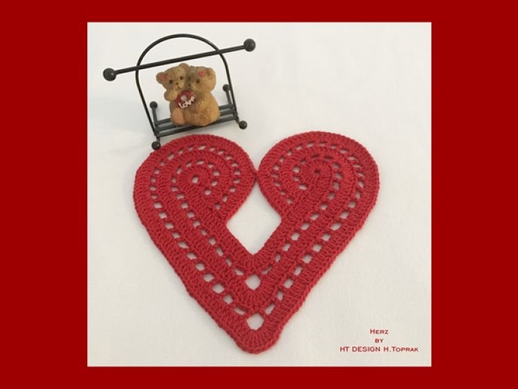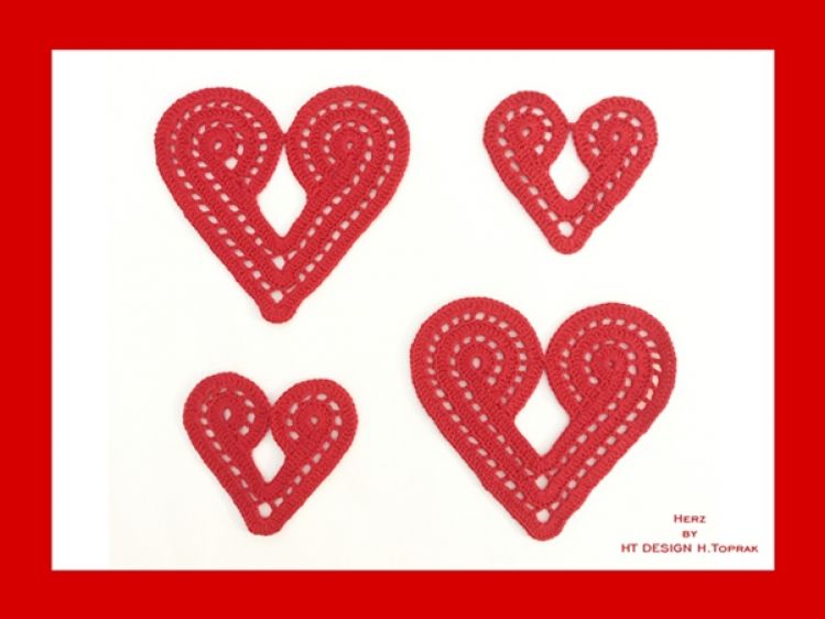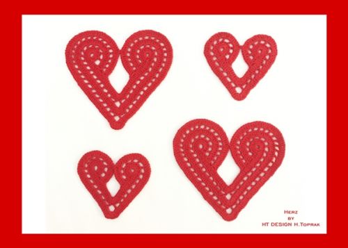 © Copyright by HT Design H. Toprak Dieses Herz ist vielseitig einsetzbar, zum Beispiel zum Aufhängen als Wanddeko ... . Es wurde bereits einmal in der Zeitschrift Anna Spezial E 499 veröffentlicht. Herz klein Grösse: ca.10 x 9.5 cm Material: Weda Ecolè 16 m Garnhäkelnadel: ca. Nr.1.75 Herz gross Grösse: ca. 16 x 15 cm Material: Weda Eocolè 40 m Garnhäkelnadel: ca. Nr. 1.75 Häkelstiche Luftmasche Stäbchen Kettmasche Schwierigkeitsgrad: Mittel Die Anleitung enthält 2 komplette Häkelschrift und Fotos.