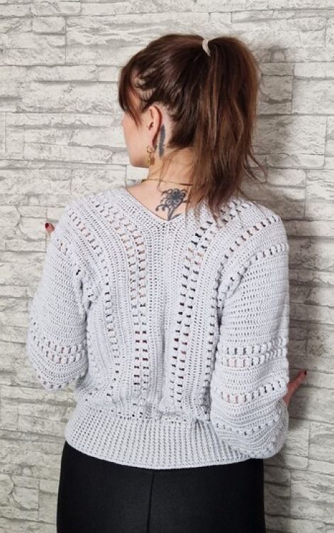 Häkelanleitung Pullover helles Mäuschen Schriftliche Anleitung für einen sehr edlen Pullover. Die Anleitung ist Reihe für Reihe beschrieben mit vielen Anleitungsbildern. Für Größe 34 bis 38. Man kann den Pullover auch leicht für größere Größen anpassen, indem man zusätzliche Stäbchenreihen einfügt. Sie benötigen: Für die angegebene Größe 34/38: Einen 4fädigen Bobbel von 50% Baumwolle und 50% Polyacryl in der Farbe Hellgrau. Verbrauch: 450g Wollwickler: BOBBEL- TEUFEL Häkelnadel Nr.3 und 4. Vernähnadel und Schere. Die Anleitung ist leicht nachzuarbeiten. Für Anfänger geeignet. Meine Anleitungen dürfen nicht kostenfrei weitergegeben werden. Nur für den Eigenbedarf.