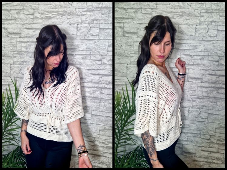 Häkelanleitung Häkelshirt Tunika Sommerwind Sanny Na auch schon Lust auf wärmere Temperaturen? Dann häkelt euch das schöne Frühlings und Sommershirt Sanny. Das Häkelshirt Tunika ist super edel und leicht. Trägt sich sehr gut. Sehr schön für den Urlaub am Meer. Ich habe die Anleitung Schritt für Schritt beschrieben. Mit genauen Reihenangaben und ohne lästige Häkelschrift. Die Anleitung ist deshalb für Häkelanfänger sehr gut geeignet. Das Modell hat Größe 36. Das Shirt ist locker und mindestens bis zu Größe 40 tragbar. Durch zusätzliche Reihen vor Ärmelbeginn kann das Shirt problemlos erweitert werden. Sie benötigen: myboshi Bamboo Elfenbein 60% Viscose 40 % Baumwolle 50g = 125m Verbrauch für Größe 36/40 = 450g Das Shirt ist problemlos seitlich erweiterbar. Hier würde ich für Größe 42/46 150g mehr einplanen. Häkelnadel Nr. 3 und Häkelnadel Nr. 4 Vernähnadel und Schere Meine Anleitungen dürfen nicht weiterverkauft, oder kostenfrei verteilt werden.