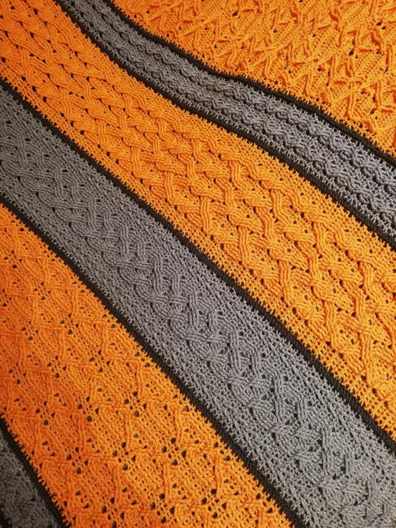 Die Decke besteht komplett aus keltischen Zopfmustern und wird in Bahnen gehäkelt, die am Ende zusammen gehäkelt werden.