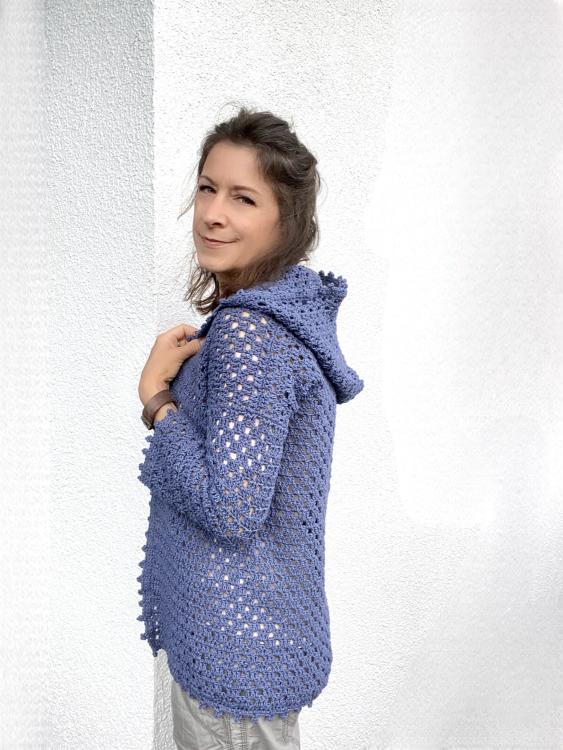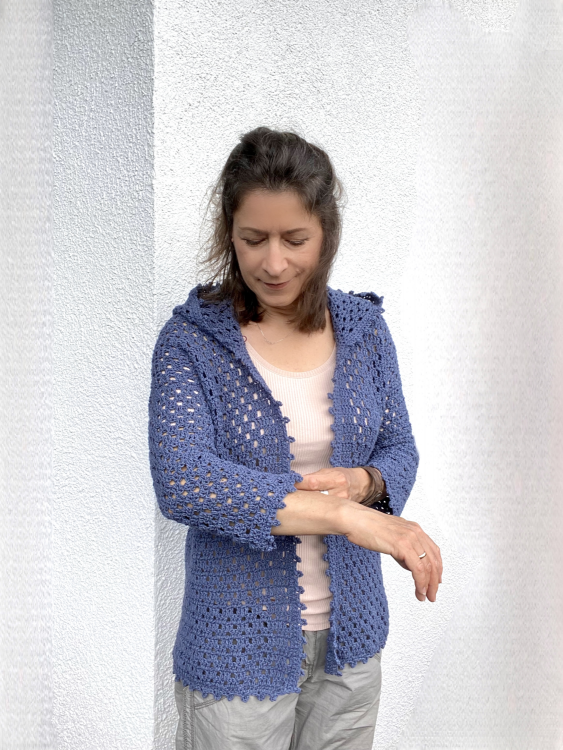 Die Jacke ist aber ganz variabel: Körper und Ärmel können problemlos verlängert oder verkürzt werden. Du kannst die Jacke natürlich auch ohne Kapuze häkeln, wenn Dir das lieber sein sollte.