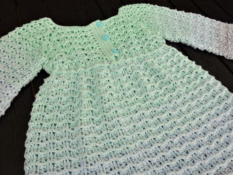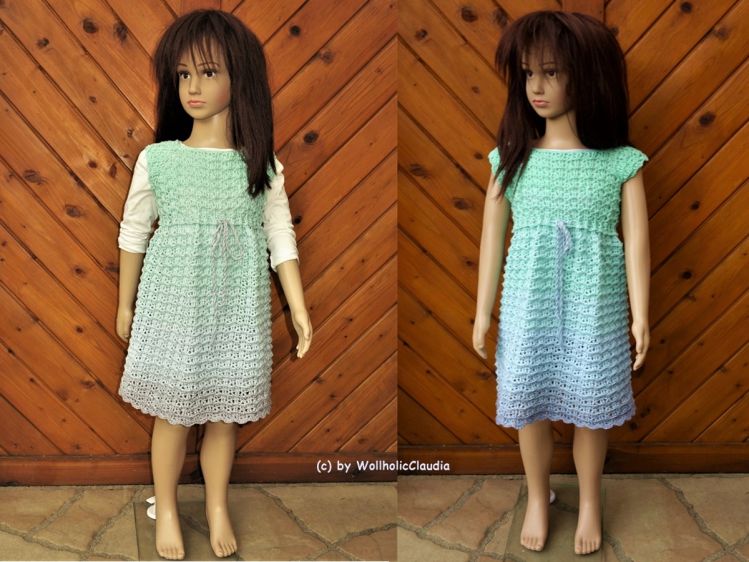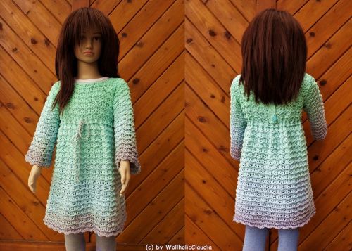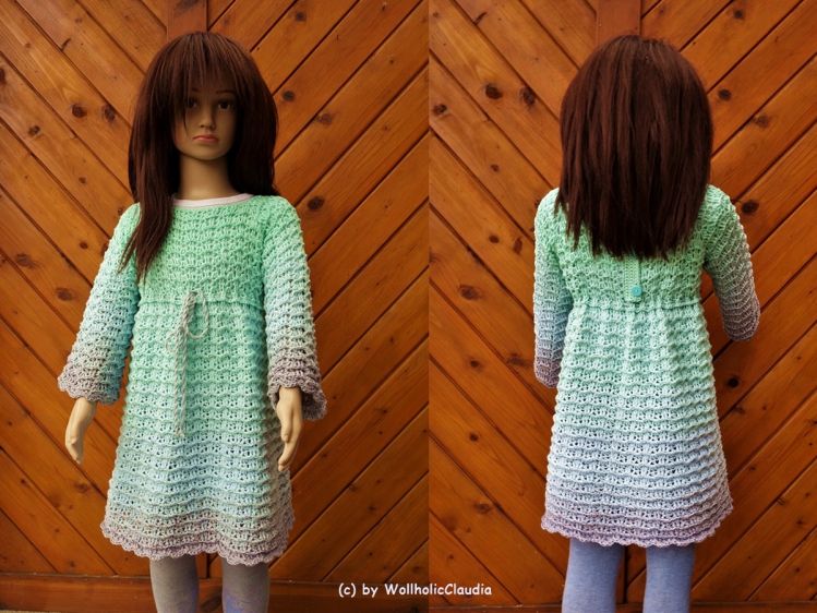 Ob für den Winter mit langen Ärmeln oder im Sommer mit Kurzarm, dieses Kleidchen kann man individuell anpassen. Das Kleid wird an einem Stück von oben nach unten gearbeitet (Raglan von oben) und ist somit perfekt geeignet für Farbverlaufsgarne. Im Rücken ist eine Knopfleiste eingearbeitet.