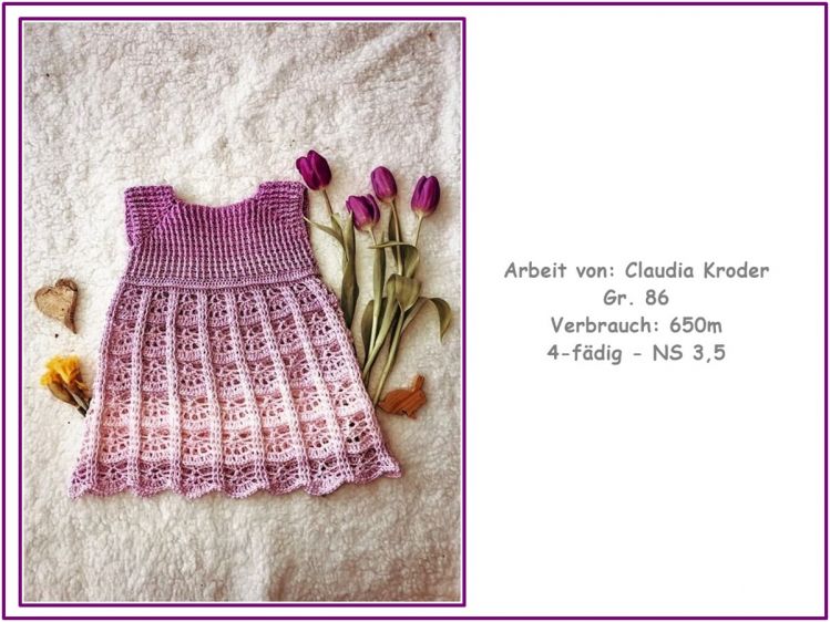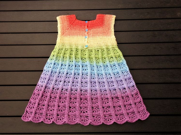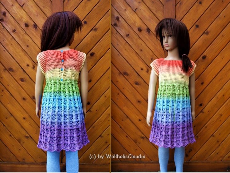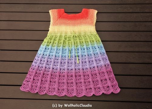 Ein wunderschönes Sommerkleid für alle kleinen Damen. Das Kleid wird an einem Stück von oben nach unten gearbeitet (Raglan von oben) und ist somit perfekt geeignet für Farbverlaufsgarne. Im Rücken befindet sich eine Knopfleiste.