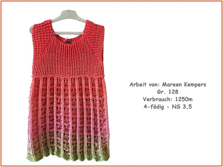 - Hier im Beispiel Gr. 98/ 104, wurden 1100m → 3-fädiges Farbverlaufsgarn verwendet