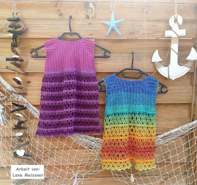 Es ist ein tolles, luftiges Sommerkleidchen, dass an einem Stück von oben nach unten gearbeitet wird (Raglan von oben) und somit perfekt geeignet ist für Farbverlaufsgarne. Im Rücken befindet sich eine Knopfleiste, die mit beliebig vielen Knöpfen bestückt werden kann.
