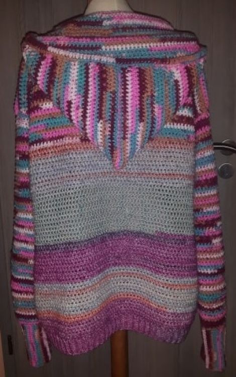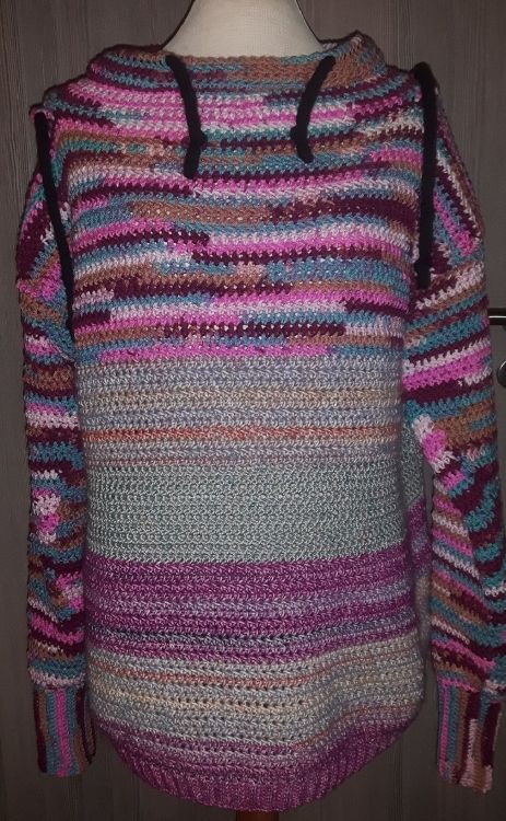 Natürlich kannst Du diesen Hoddie auch aus Farbverlaufswolle oder einfarbig häkeln. Man beachte aber, dass die verwendete Wolle ungefähr die gleiche Stärke haben muss, als die, die ich verwendet habe.