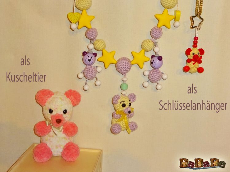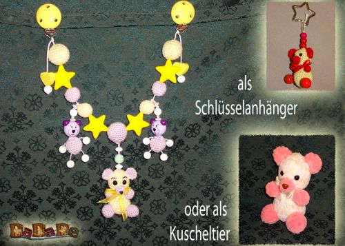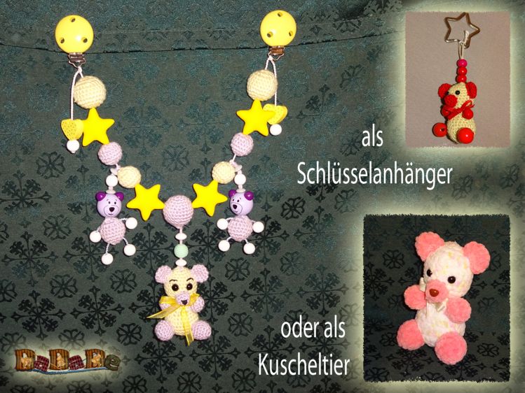Mit den einzelnen Teilen lässt sich außer der Kinderwagenkette, auch Schnullerketten, oder