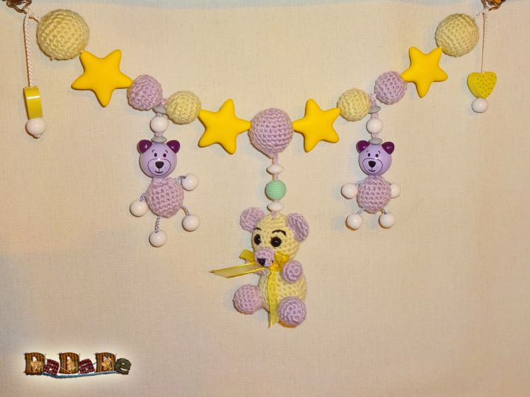 In die Kette sind Rassel eingearbeitet die zum Spielen, Kuscheln und Greifen animieren.
