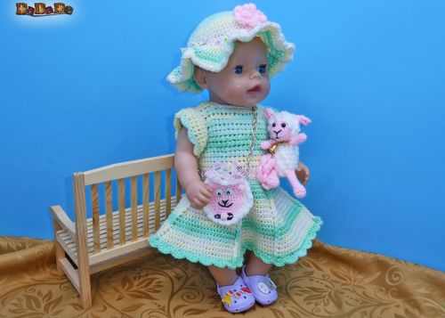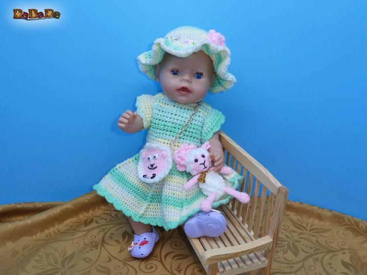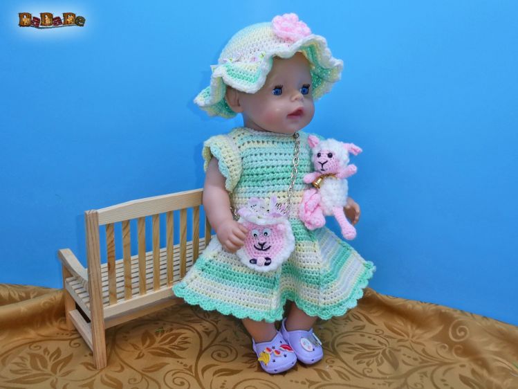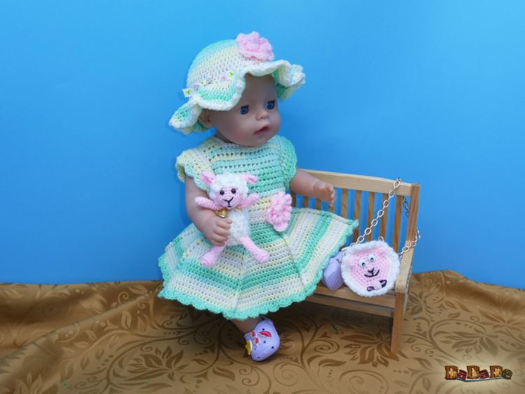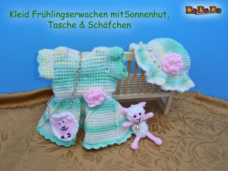 mit Kleidchen, Sonnen-Hut, Tasche und süßem Schäfchen. Auch Püppis brauchen was zum Kuscheln.