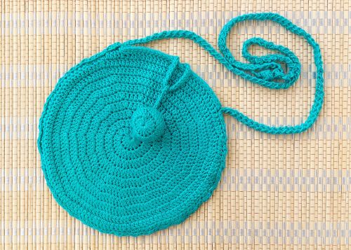 Die Tasche wird in Runden gehäkelt. Verschlossen wird sie mit dem gehäkeltet Bommel. Die Länge von dem Schulterriemen kann individuell angepasst werden.