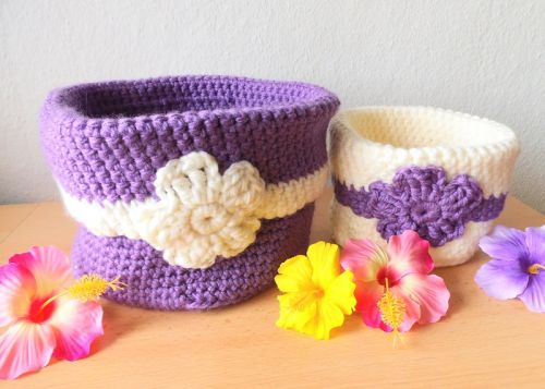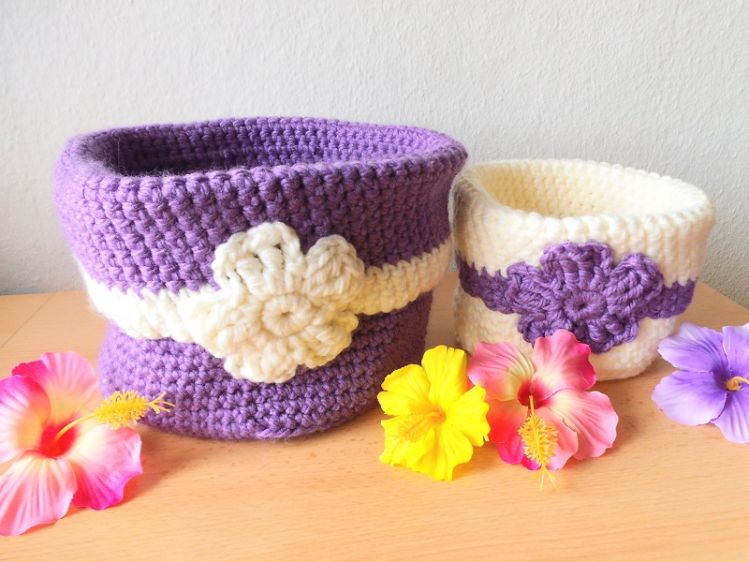 Dieses wunderschöne Utensilo-Duo mit einer Blüten-Applikation gibt es in 2 unterschiedlichen Größen und ist recht zügig und einfach gehäkelt und kann im Anschluss fast überall zur Anwendung kommen.