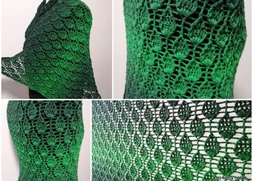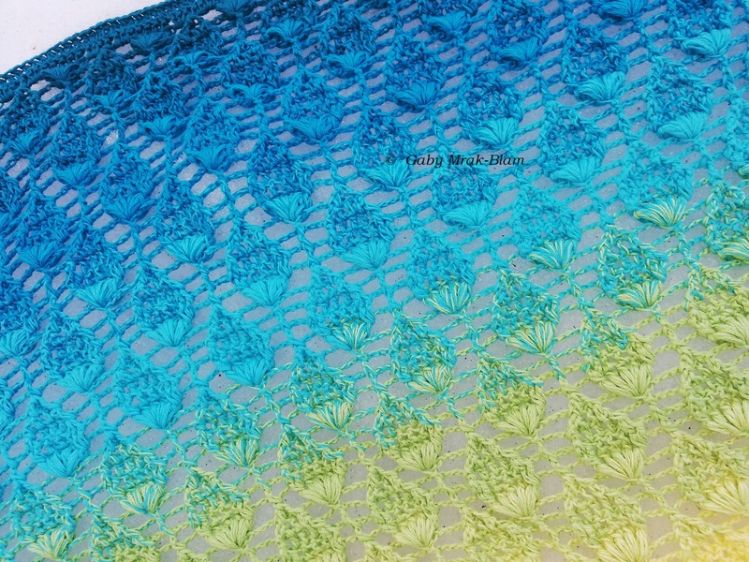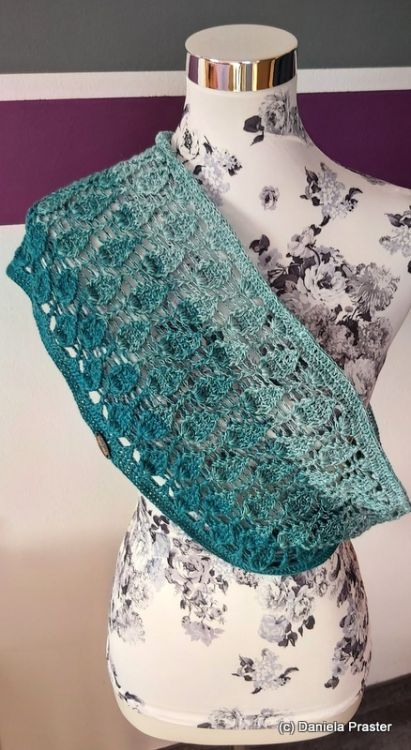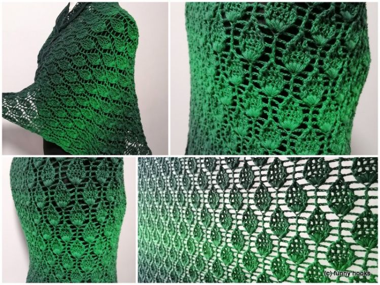 Für die Variante im Titelbild hab ich 1250 m “cotton cordula”, 3 fädig von Rennratterls bunte Wollwunderwelt sowie eine Häkelnadel Wood der Stärke 3,5 mm. Dies ergab eine Größe von 175 x 70 cm.