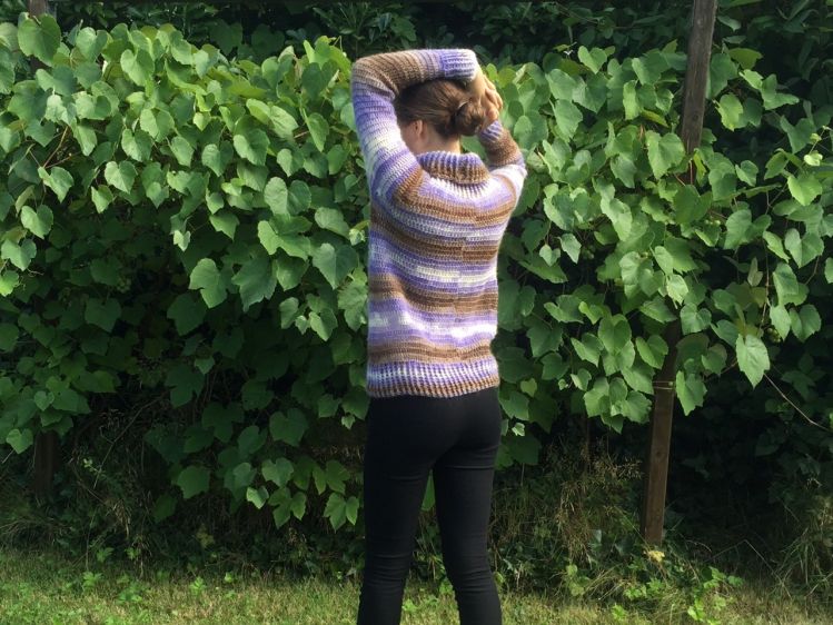 Ich habe in meinem Beispiel einen Pullover für die Größe 36/38 gehäkelt. Verbrauch in dieser Größe ca. 220g.