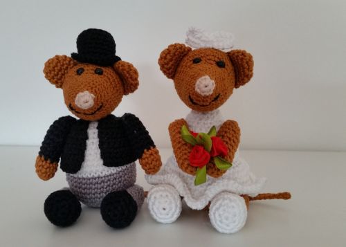 Maus und Mäuserich sind schon ganz aufgeregt: Heute ist ihr großer Tag... sie werden endlich heiraten. Richtig schick haben sie sich gemacht... Die Braut in weiß und mit einem Strauß roter Rosen und der Bräutigam mit Frack und Zylinder.