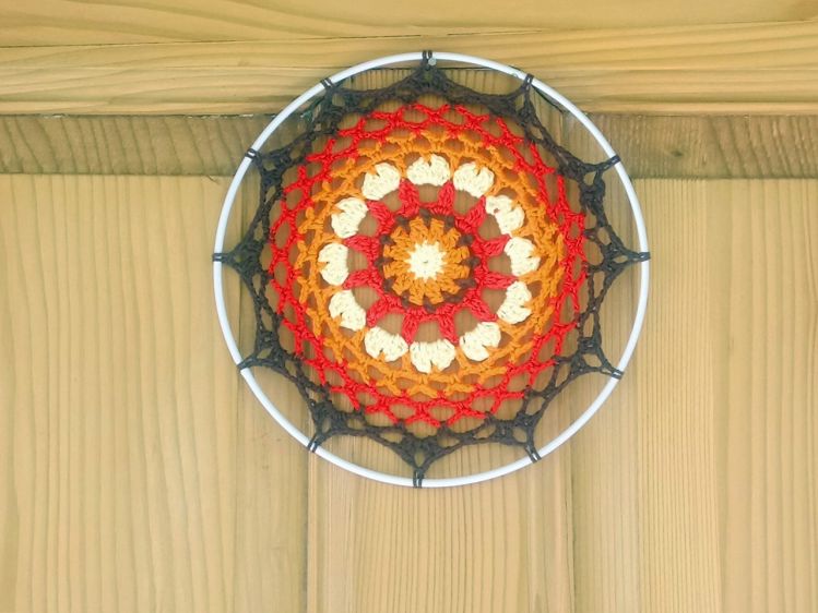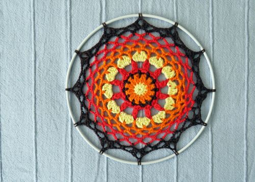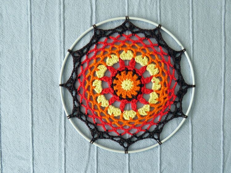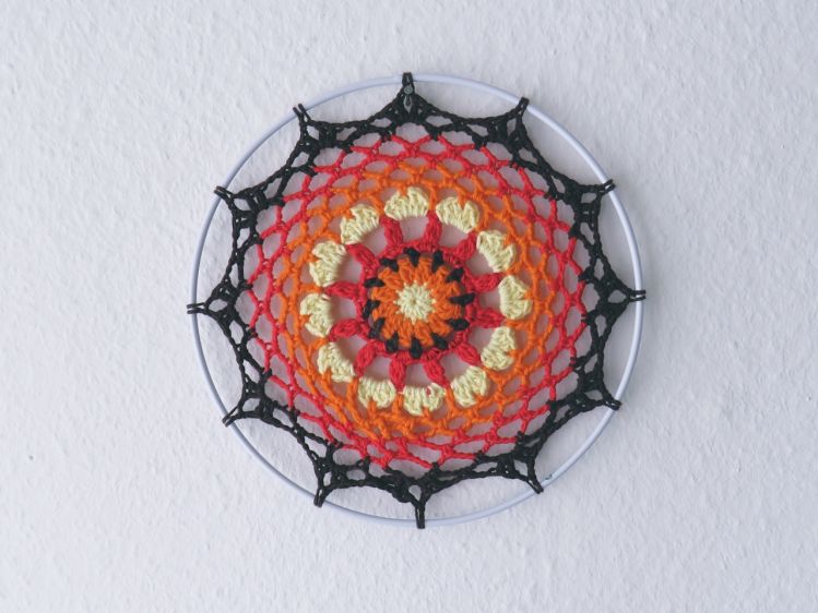 In nur 12 Runden erschaffst du dir dein eigenes Mandala aus dünner Baumwolle, mit der Häkelnadel 2,5 gearbeitet. Du kannst Reste verwenden und auch eine andere Farb- Zusammenstellung.
