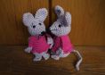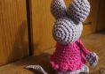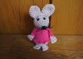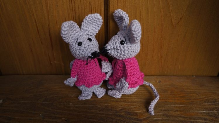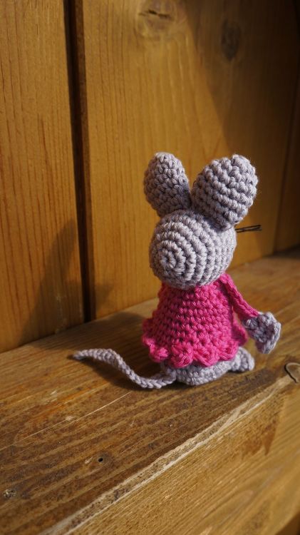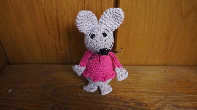 - ca. 15g Wolle oder Garn in der Farbe grau, sowie ca. 10g Wolle/ Garn in der Farbe pink (für das Kleid und die Arme). Beide Farben sollen für eine 3mm Häkelnadel geeignet sein