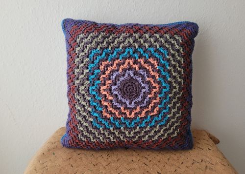 Kleine bunte Sofakissen mit den Maßen 30mal 30 cm können jedem Wohnzimmer den besonderen Farbkick bringen. Das Mosaik Kissen, das ich gestaltet habe, ist auf einer Seite mit 2 Farben gehäkelt worden und auf der Rückseite kräftig bunt. Auch wenn der Effekt ganz besonders auffällt, ist die Häkelart denkbar einfach und besteht nur aus 2 Maschenarten.
