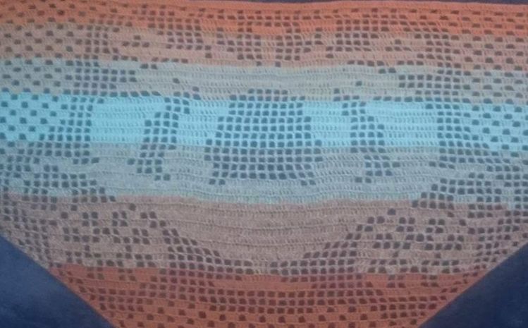 Das Motivtuch wurde mit einem dreifädigen Farbverlaufsgarn gehäkelt. Verwendet wurden ca. 600 Meter. Damit hat das Tuch eine Größe von etwa 160x60 cm.