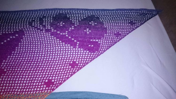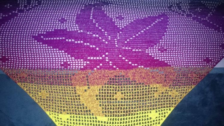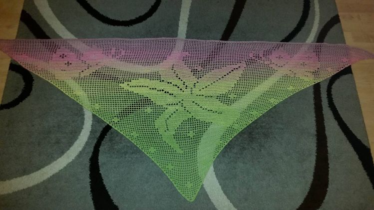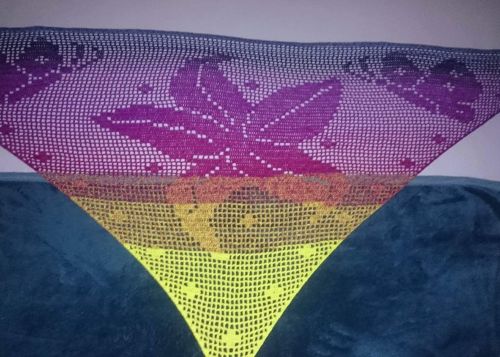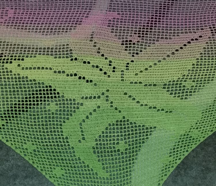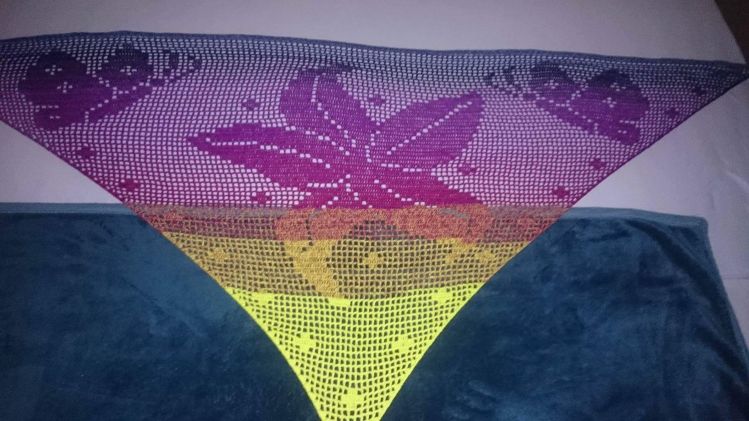 Gehäkelt wird von unten nach oben. Benötigt werden Grundkenntnisse beim Häkeln von Luftmaschen, Stäbchen und Doppelstäbchen. Das Motivtuch wurde mit einem dreifädigen Farbverlaufsgarn gehäkelt. Verwendet wurden ca. 1000 Meter. Damit hat das Tuch eine Größe von etwa 210x95 cm.
