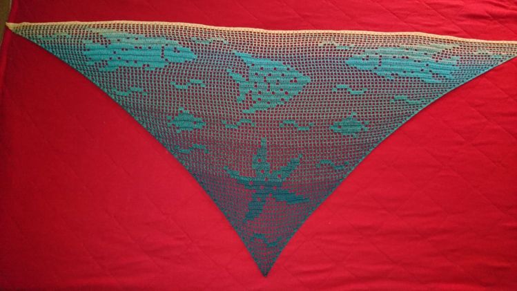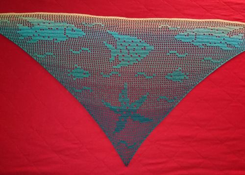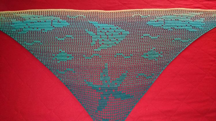 Die Anleitung ist auf 4 Seiten in teilweise Schrift (Erklärung Filethäkeln), der Anfang des Tuches in Häkelschrift und Zählraster geschrieben.
