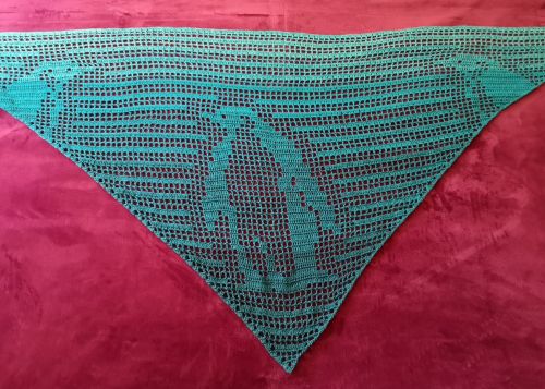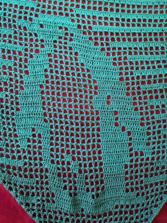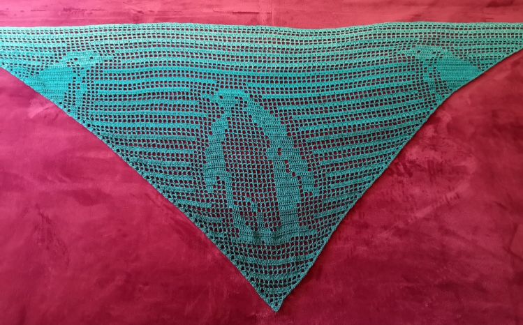 Die Anleitung ist auf 4 Seiten in teilweise Schrift (Erklärung Filethäkeln), der Anfang des Tuches in Häkelschrift und Zählraster geschrieben.
