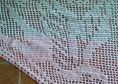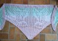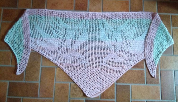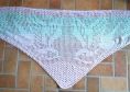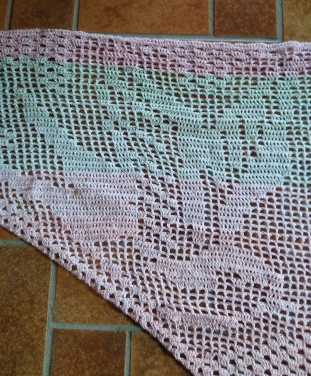 Die Anleitung ist auf 4 Seiten in teilweise Schrift (Erklärung Filethäkeln), der Anfang des Tuches in Häkelschrift und Zählraster geschrieben.
