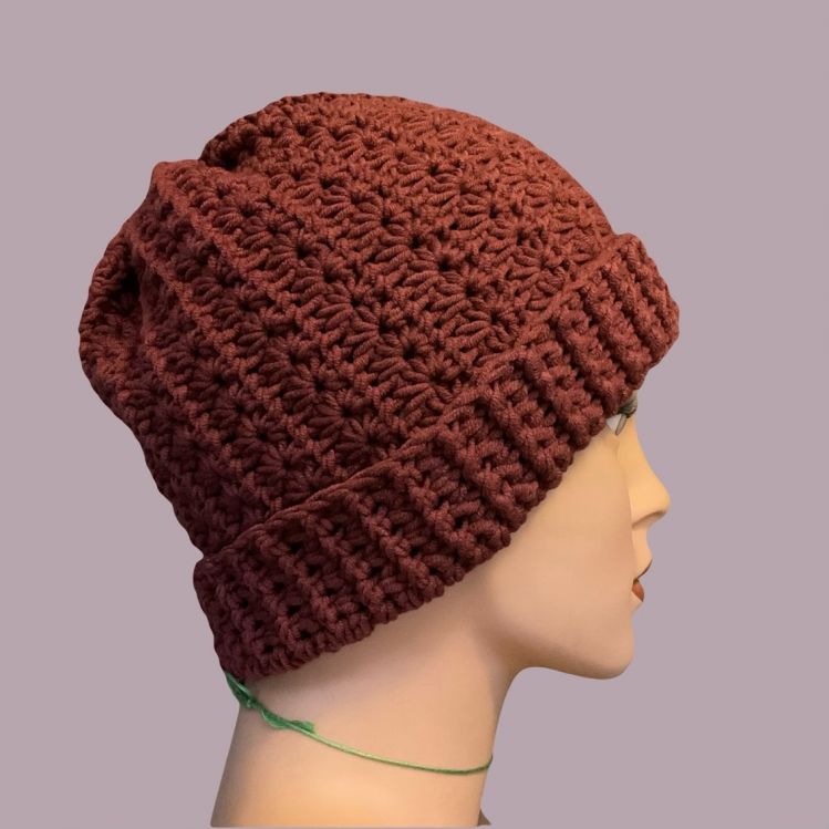 Die Mütze ist individuell erweiterbar. Das Grundmuster muss so lang gehäkelt werden, bis der Kopfumfang erreicht ist.