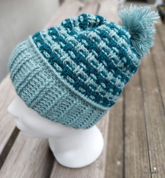 Mein Verbrauch für das Haubi im Titelbild (Erwachsenengröße) waren 90 g Merino/Polyacryl, 3-fädig von Funny Hooks Bobbel
