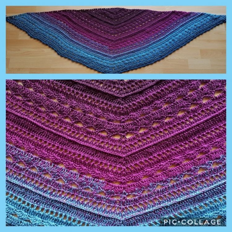 Mein Tuch hat eine Grösse von ca. 170x48cm (ungespannt) mit einem Bobbel von 800m 4 fädig.