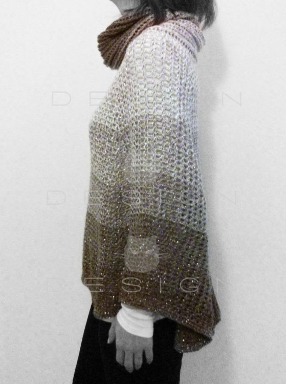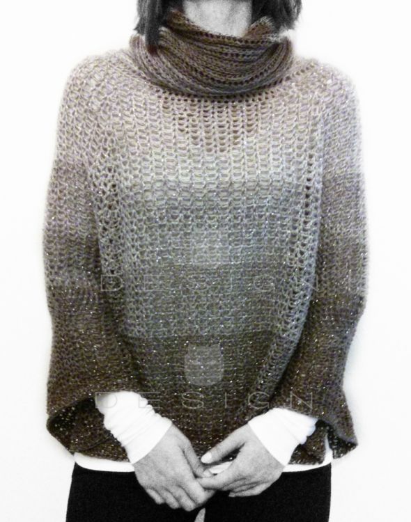 Ein leichter Poncho der trotzdem wärmt. ** Er wird in Runden von oben nach unten gehäkelt und dabei werden die Seiten definiert. Der Loop wird direkt an den Pochon angehäkelt und kann in 2 Variatonen ausgeführt werden. Die Anleitung ist in schriftlicher Form sowohl auch teilweise mit zusätzlicher Häkelschrift versehen. Material: 1000-2000m Nadelstärke: 5,0mm