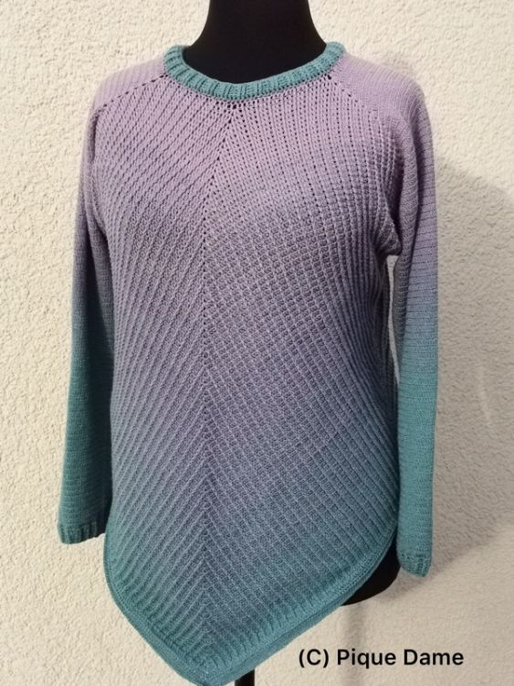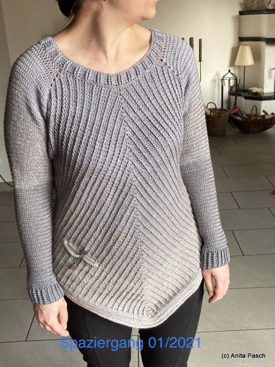 camminata - heißt dieser Pulli, der sich ganz einfach häkeln lässt. camminata wird als RVO gearbeitet und besteht aus einem einfachen eingängigen Muster und geht schnell von der Hand.
