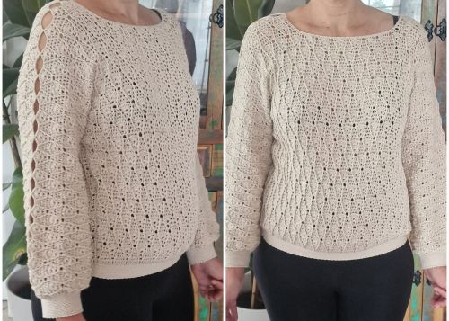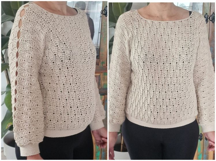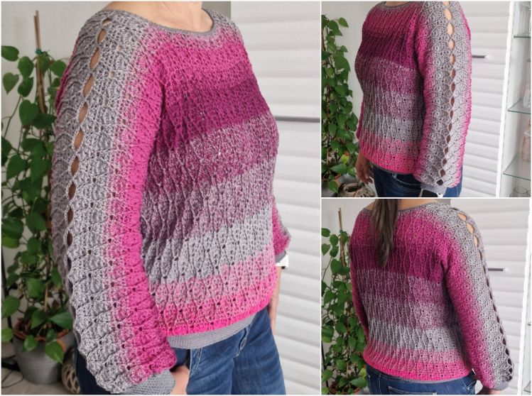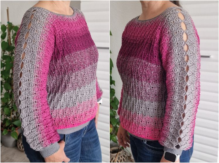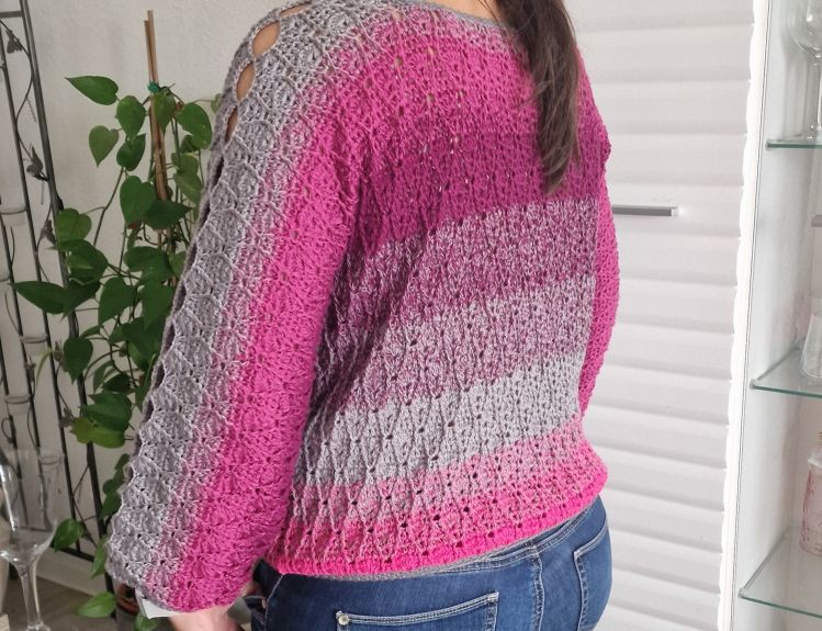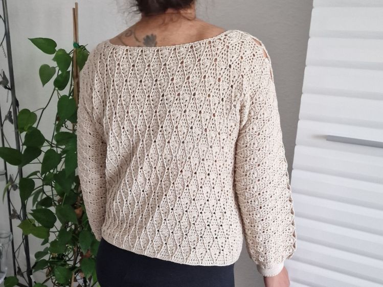 Nach dieser Anleitung kannst Du dir einen modischen Pulli häkeln. Nicht nur das Spitzenmuster besticht durch seine raffinierte Optik, sondern auch die offenen Nähte über Schulter und Ärmel sind ein absoluter Eyecatcher.