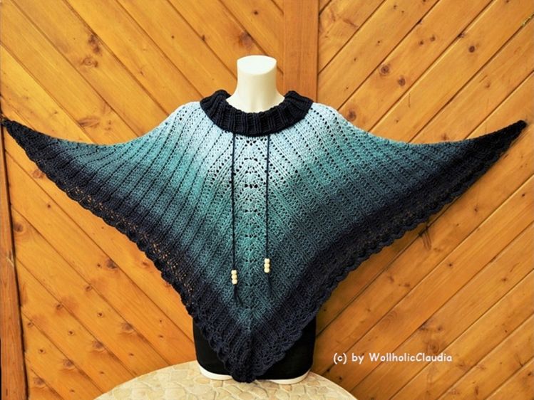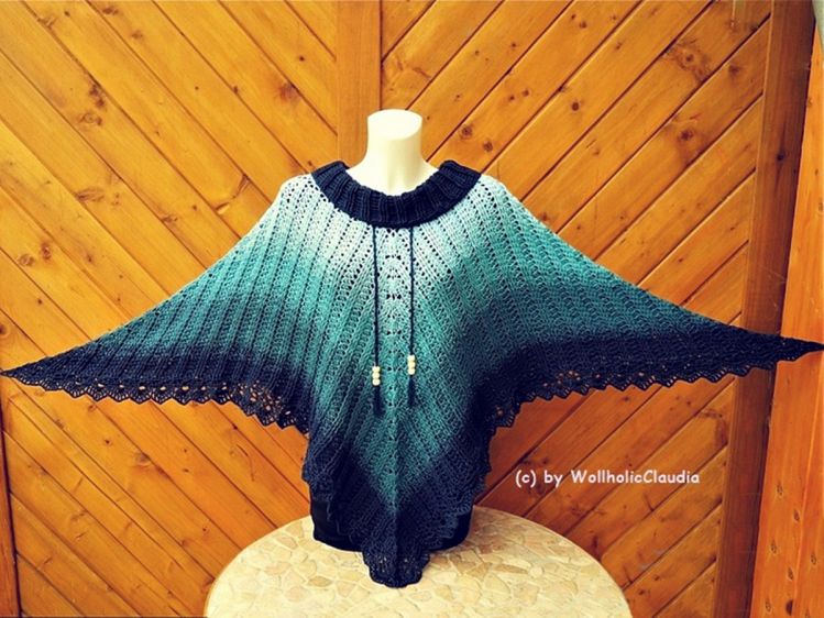 Dieser Poncho namens “ Mitternachtstraum “ ist perfekt, um dem ersten Herbstwetter zu trotzen. Man hat verschiedene Möglichkeiten ihn zu tragen und bei starken Wind kann der Kragen einfach zugezogen werden.