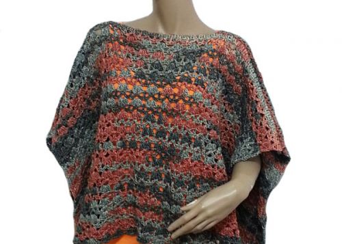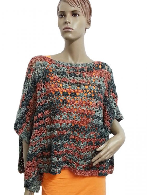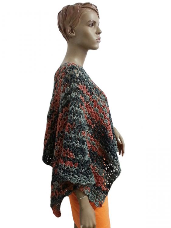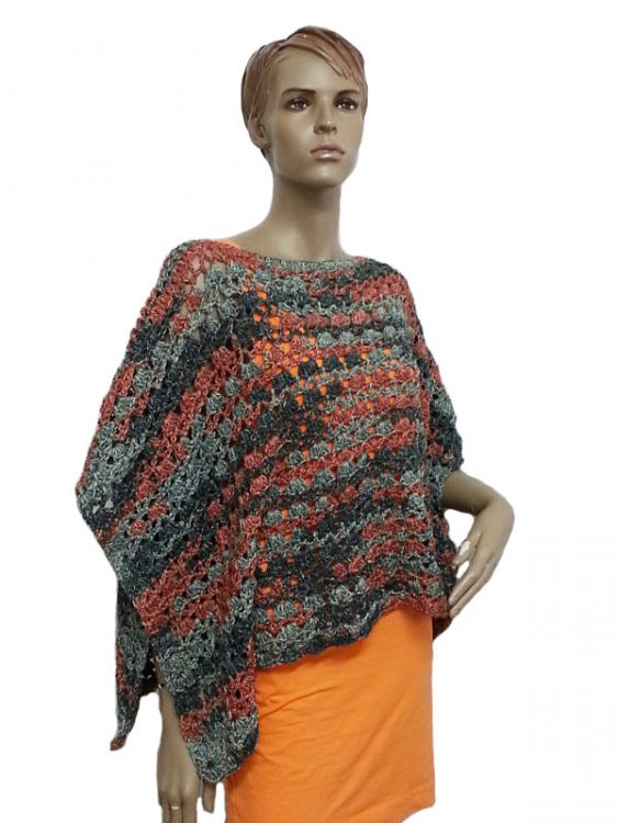 Der Poncho wird in 2 Teilen gehäkelt, es sind gerade Teile die dann zusammen genäht werden. Der einfache Schnitt kann auch von Häkelanfänger/innen sehr gut nachgearbeitet werden. Ich habe eine 8fach Sockenwolle von Opal für Nadel Nr. 4 verwendet.