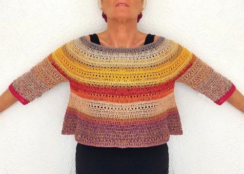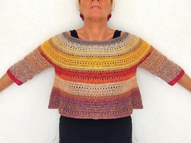 *Das Oberteil wird vom Halsausschnitt bis zum unteren Saum gehäkelt. Wir haben keine Nähte.