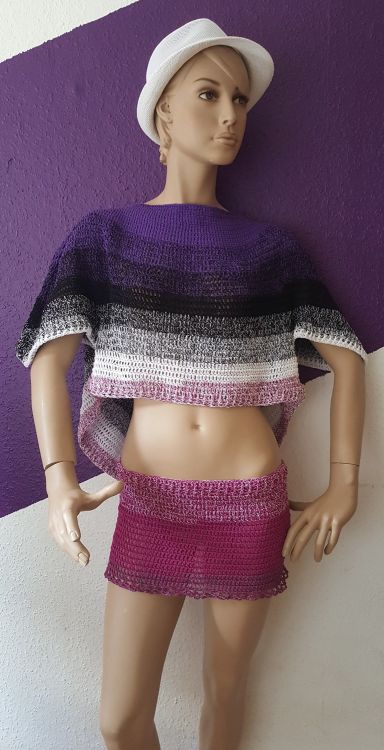 Dieses tolle Set lässt euch garantiert zum Blickfang werden, tragbar im Sommer aber auch gut kombinierbar im Herbst mit Leggings und tollen Stiefeln. Der Ponch-Pulli sowie der Rock sind aus einem Bobbel entstanden, Lauflänge 1500 m mit Nadel 4.