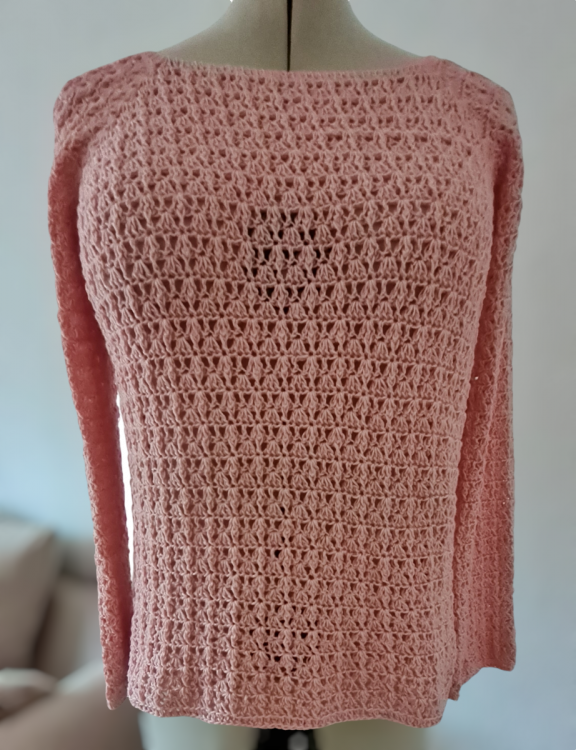 Der abgebildete Pullover wurde in der Größe 40/42 gearbeitet.