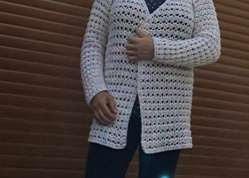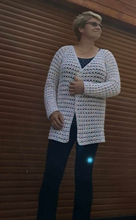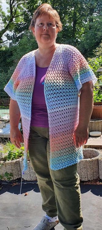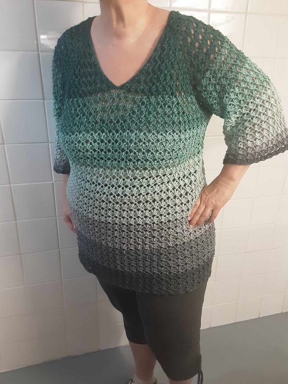 Schließlich meinten meine Tesster, dass man daraus auch eine hübsche Jacke machen kann. Durch den V-Ausschnitt hat man auch da die Wahl, ob man die Jacke gerade runter, oder gar als Wickeljacke häkelt. auch hier gilt, das Muster kann auch gewendet getragn werden.