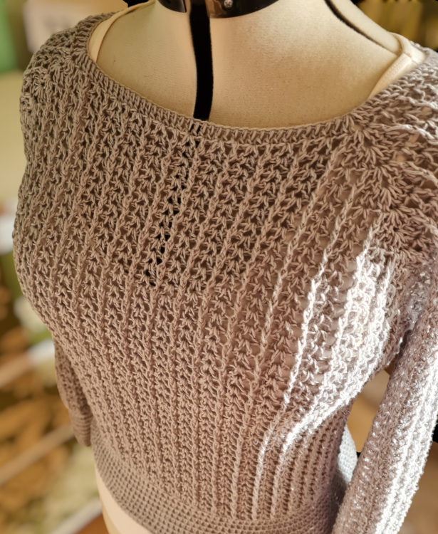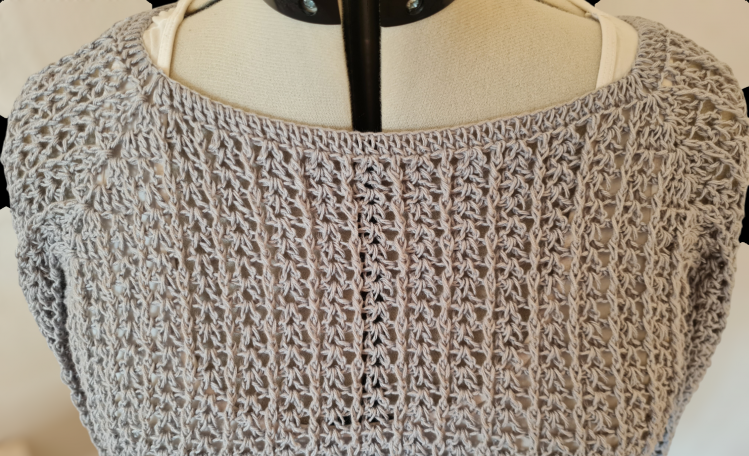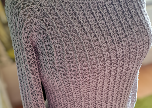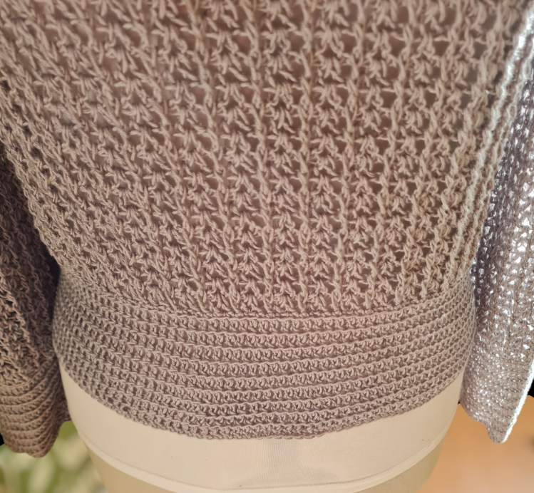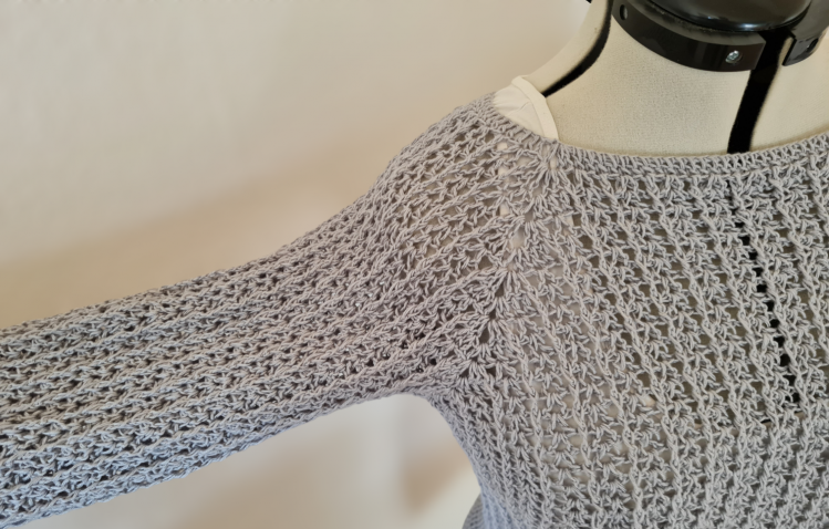 Zuerst wird der Korpus gehäkelt. Danach werden die Ärmel direkt angehäkelt.