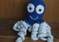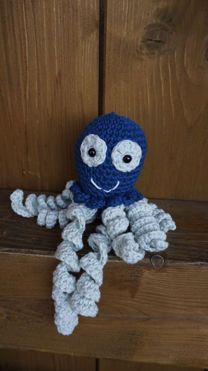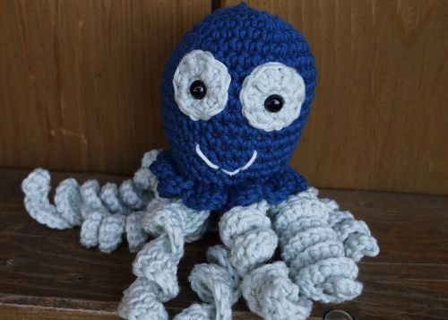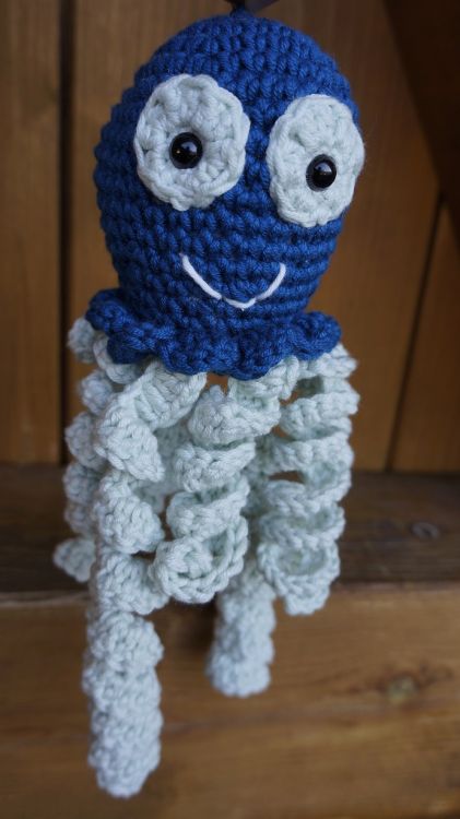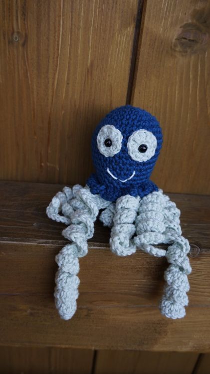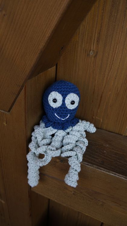 - Restwolle in einem anderen Farbton für die Augen und Tentakel (ich habe ein helles türkis verwendet), ebenfalls für eine 3,5mm Häkelnadel geeignet.