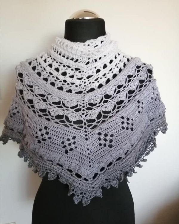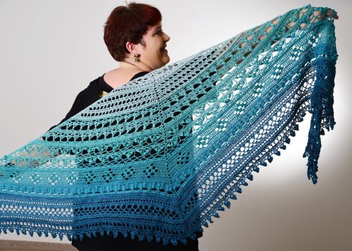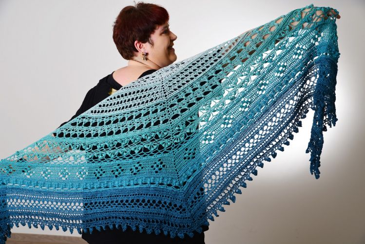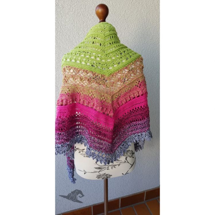 Here you get the instructions for a rather flat triangular scarf, which is worked with very varied patterns.