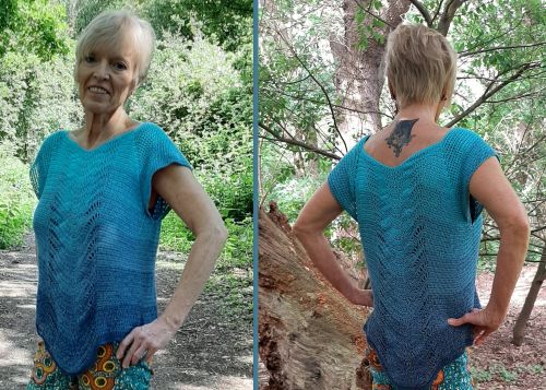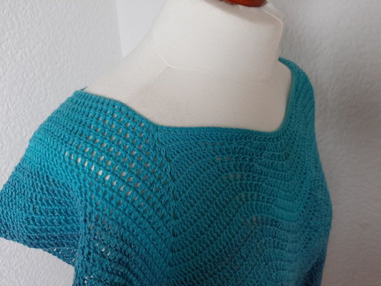 Das Shirt wird mit Luftmaschen, festen Maschen, Stäbchen und Doppelstäbchen gehäkelt.