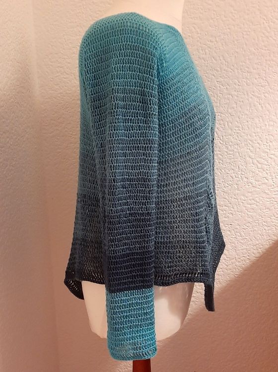 Größe M-L (Brustumfang ca.112cm, seitliche Länge ab Schulter ca. 54cm).Das ist meine gehäkelte Größe.