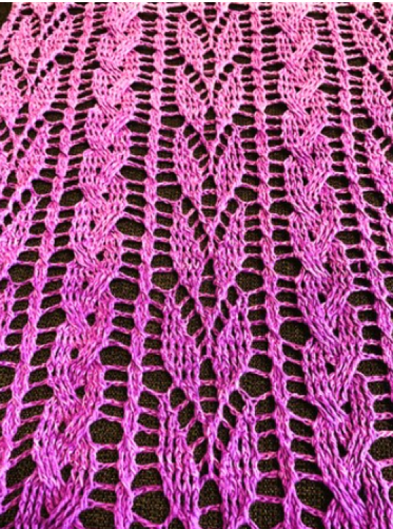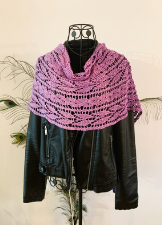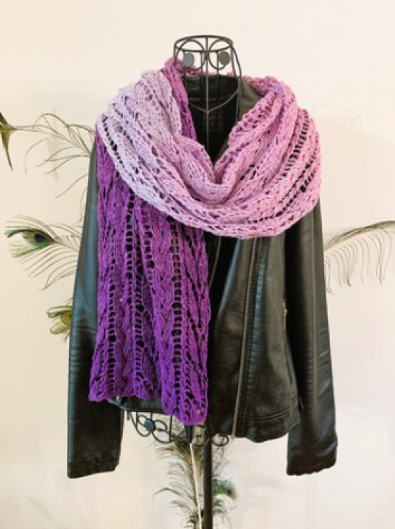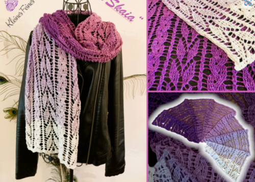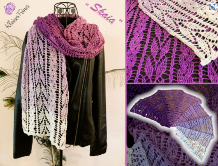 Der Schal Skaia ist sehr schnell gehäkelt, das Muster wiederholt sich nach einigen Reihen und geht gut ins Gedächtnis über. Er besticht durch ein luftiges Muster aus Reliefmaschen und Luftmaschen, kleine und größere Zöpfe wechseln sich mit einem Blattmuster ab.