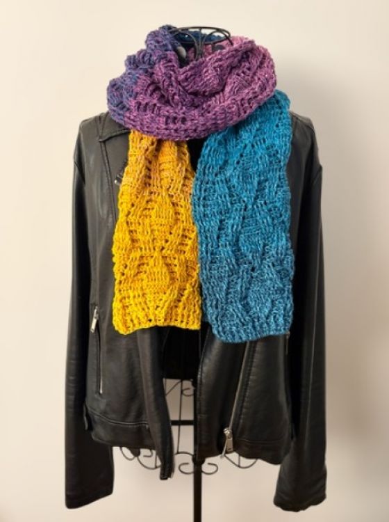 The scarf can be crocheted in any size, as the rows are repeated. Please note that if you use a different wool, a different needle size or generally crochet looser/tighter, the size may vary.